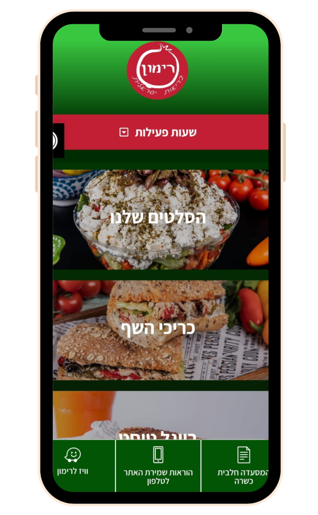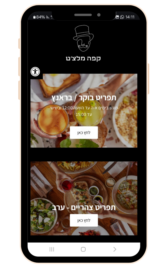 התפריט הדיגיטלי מעוצב בהתאמה מלאה לצרכי העסק שלך, כולל צבעים, לוגו וסטיילינג שמתאים למותג שלך. העיצוב מותאם למובייל ולמחשב כך שהלקוחות שלך יוכלו לצפות בתפריט מכל מכשיר בנוחות.